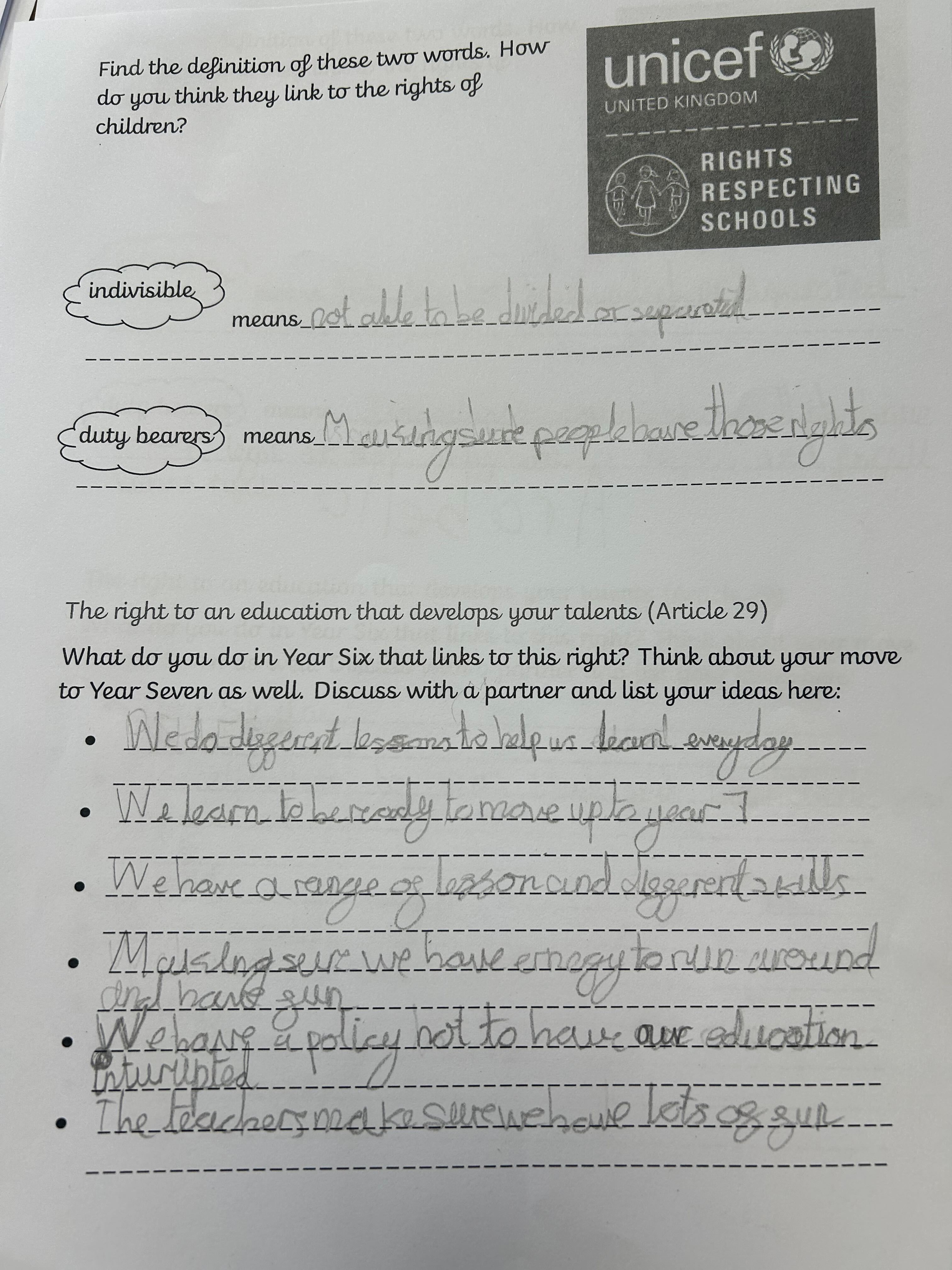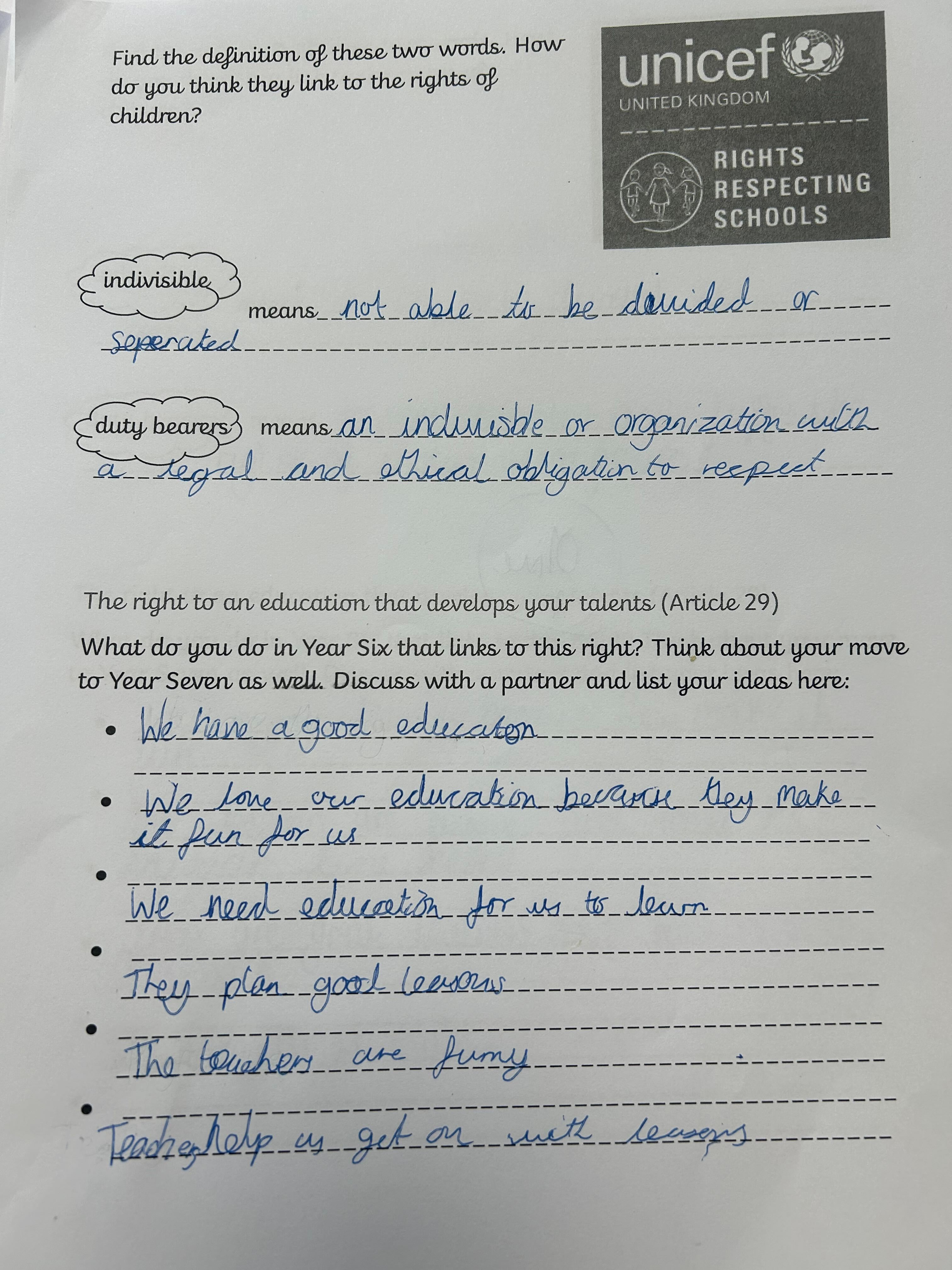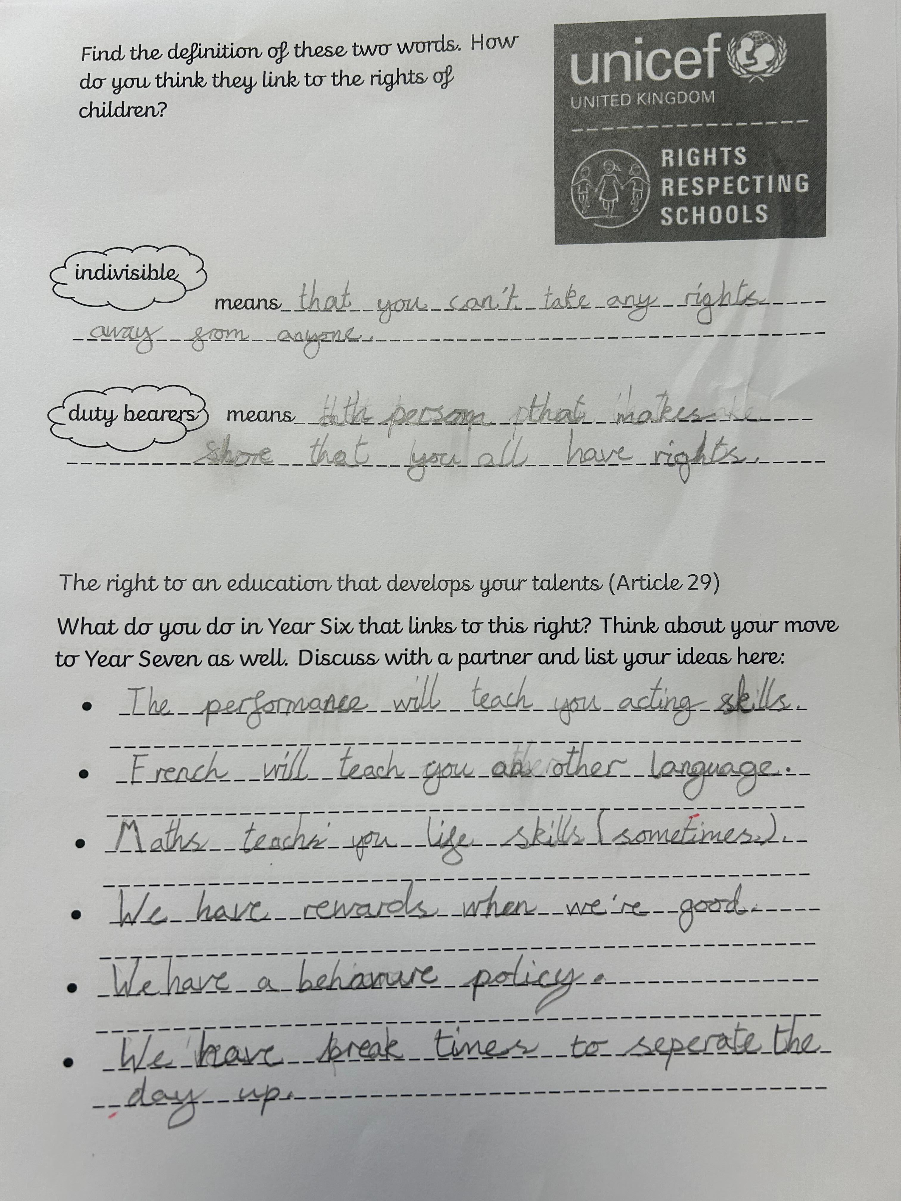 You may have noticed lots of our rights respecting blog posts have been mentioning a ‘Right of the Term’ recently. This is something that has been set up so each year group can learn about all the different articles on the convention on the rights of the child (see more here https://www.unicef.org.uk/what-we-do/un-convention-child-rights/) without feeling overloaded – there are over 40 of them after all! As the children move up through the school they will access different rights in different year groups and revisit ones they have covered before to ensure they are embedded. We are working hard to include our rights of the term in our every day learning and we will be introducing more information about them through assemblies and worships.
