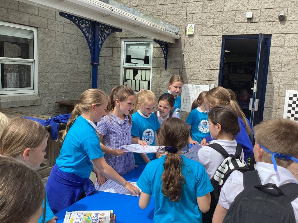 Yesterday afternoon, the Rights Ambassadors were outside Yr 6 giving out leaflets and letting parents know about their Rights Respecting learning.
